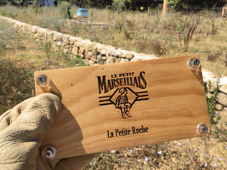 La/les ruches appartienent à l'entreprise Parraine. Une plaque en bois avec son logo gravé est fixée à l'avant de la ruche.